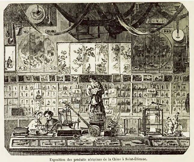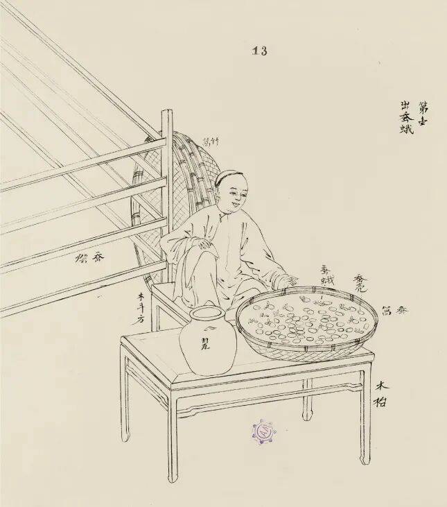——再说说图版的设计。图版按版本分类排列:A版、B1版、B2版各成一组,每幅图下标有编号、原文、释文、法文、粤语等信息。如A版“斩桑枝”图,下面既列原文“年尾雪霜既,桑枝苍老,则用刀斩去长枝”,法文“Taille des mûriers nains”,亦附释文“冬天桑枝老化后,砍去长枝保留主干,来年春天就能发出新枝”。B1版中“出蚕蛾”图,标注“蚕架、竹䈑、蚕䈑、蚕壳、蚕蛾、罂、木斗方、木台”图中信息,搭配法文“Les papillons percent leurs cocons”及粤语“Tchu-tsan-ngo”。这样一来,技术研究者与外销文化爱好者都能找到对应的内容。